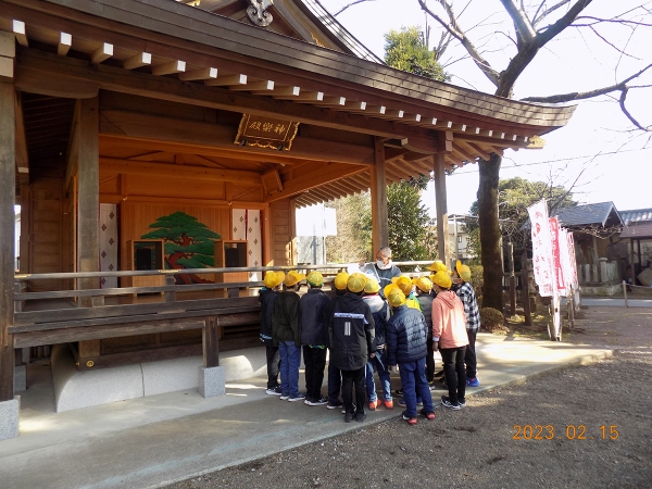 今年も新型コロナウイルス感染予防で手水舎の柄杓、鈴緒(鈴)の撤去をしましたので、密を避けるためこれらの作法は行わず、各班ごとに作法の説明と神社の歴史の説明、境内地の見学を行いました。